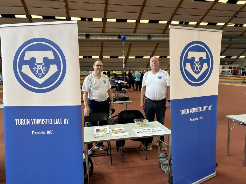 Kupittaan urheiluhallissa liikuntaneuvontaa ja kuntomittausta. Hannu Jalonen ja Risto Laine päivystivät seuramme messupisteessä.